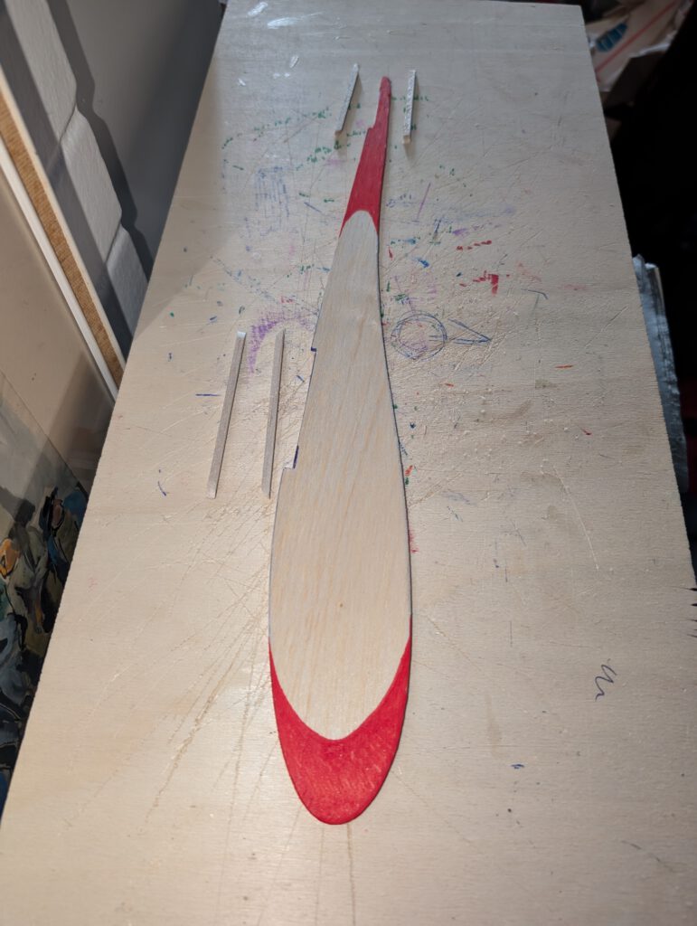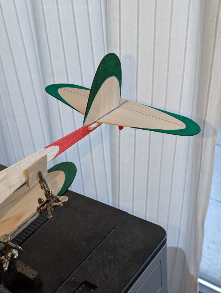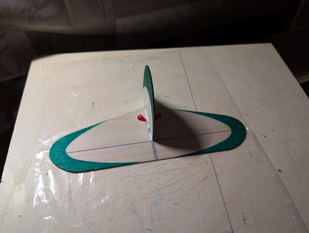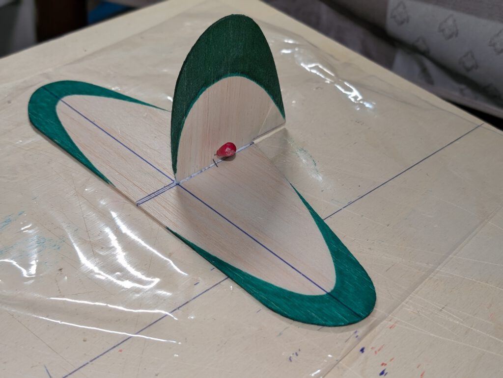 Cement fin on horizontal stab as shown on photos. Check symmetry and hold in place with pins. Let dry.