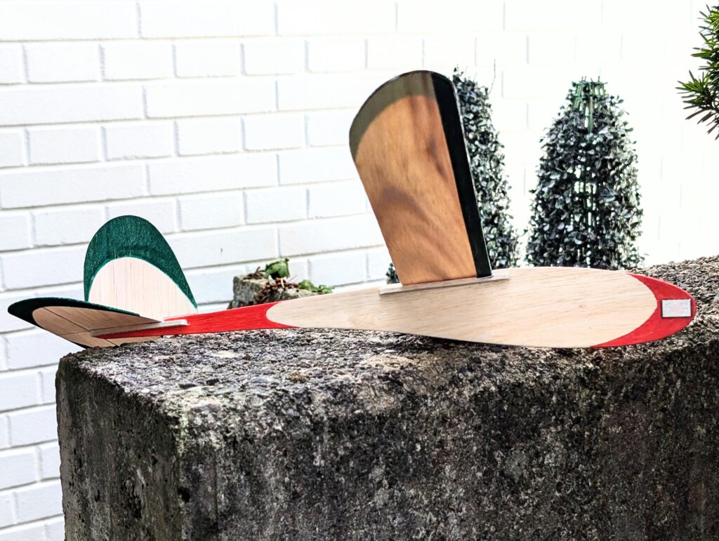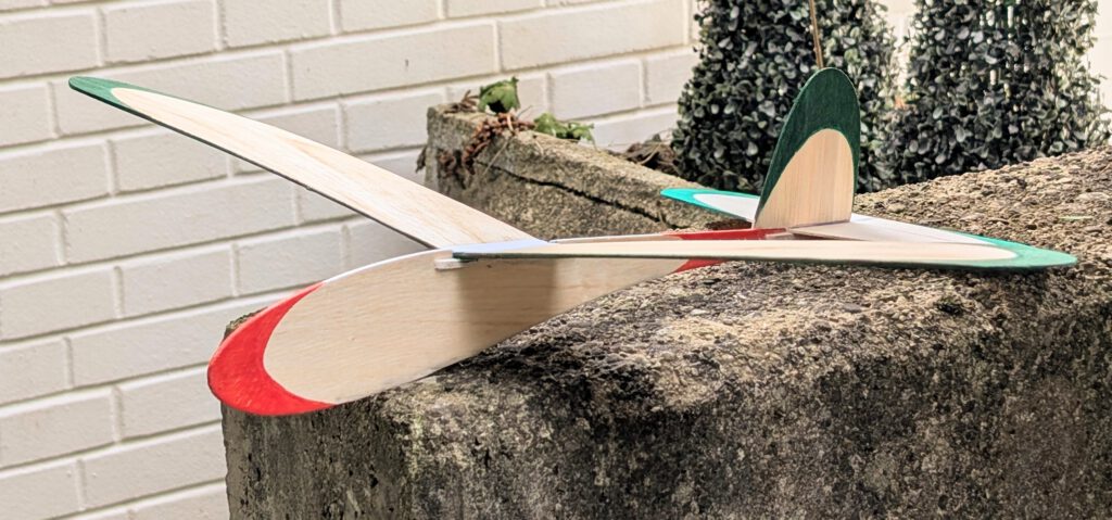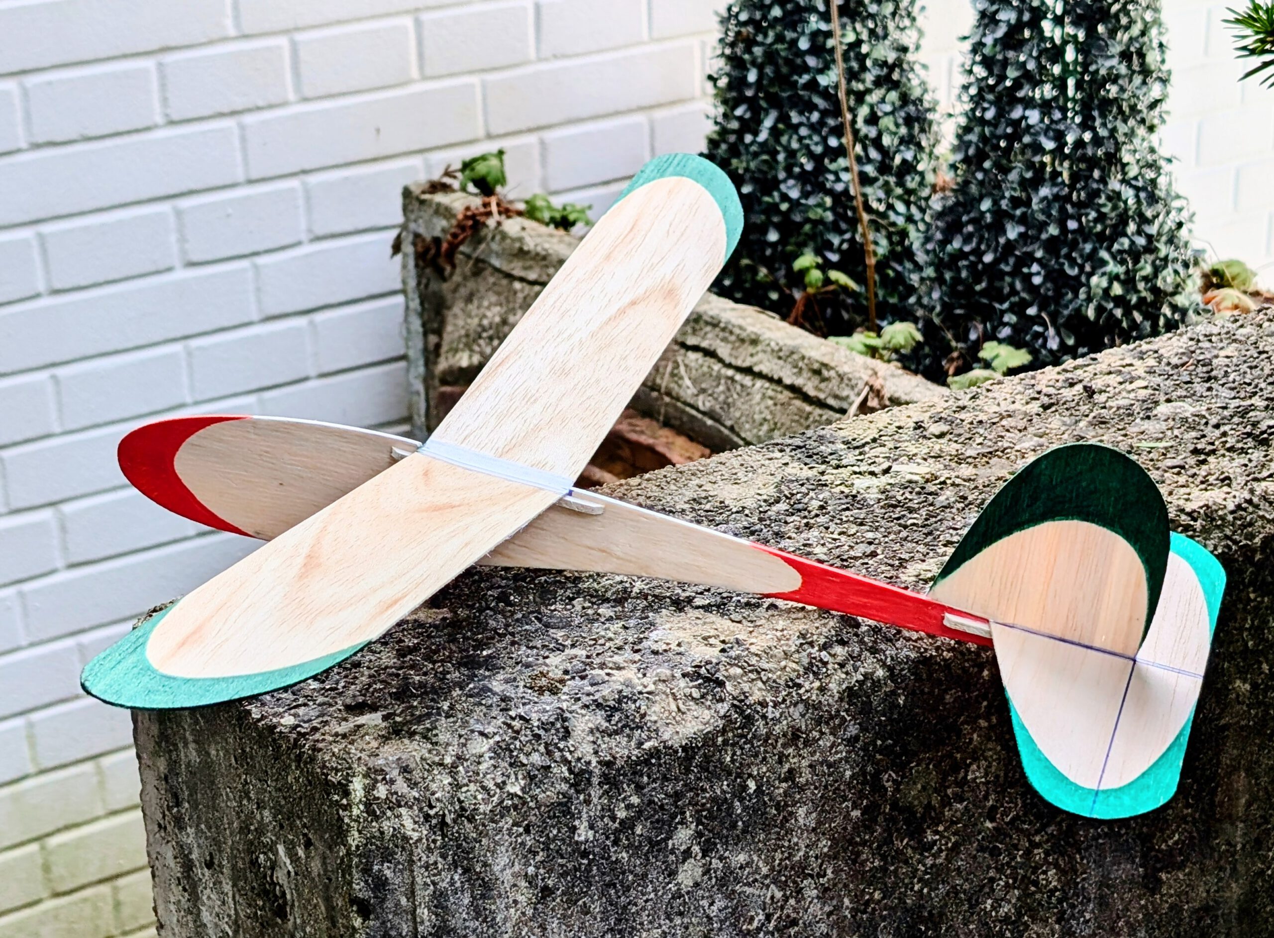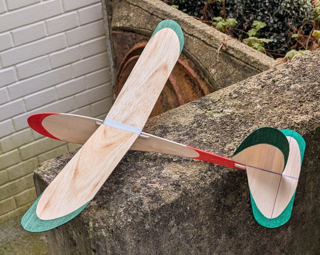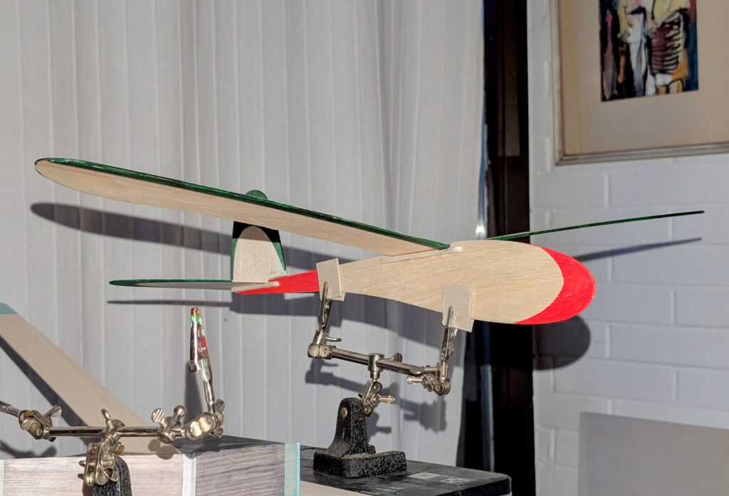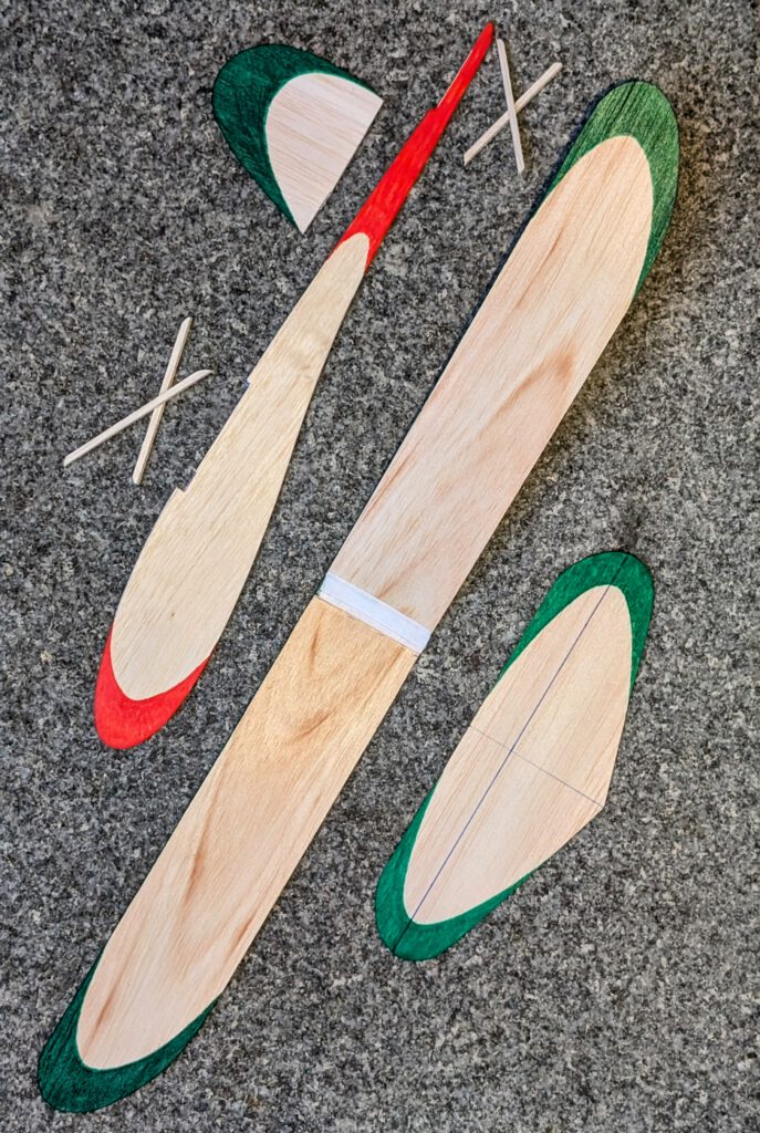 Cut out balsa parts in accordance to plan. Sand well (photo). Make templates and transfer outlines on fuselage, wings and empennage. Paint your model at this stage (photo).