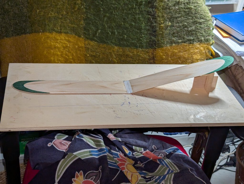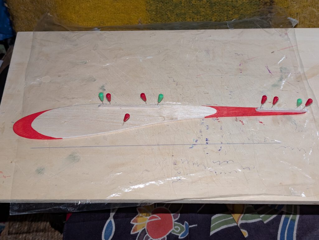 Wing consists of a right and a left wing half. Cement reinforcement strips on leading edge undersides of each wing half. When dry sand LE round. Fix one wing half on building board with pins. Cement corresponding half by paying attention to dihedral (11 cm) given in plan. When dry reinforce center joining area with linen band (photo) and let dry.
