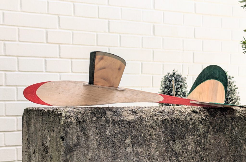 If wing has tendency to rest only on one side, then it is too heavy on this side. To compensate the imbalance, disperse a small amount of white wood glue on the opposite wing tip area and let dry. Do it, if necessary, twice until balance is obtained.