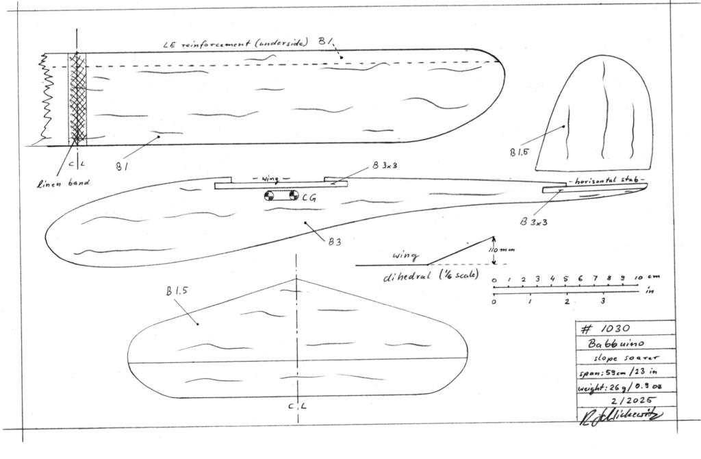 Fuselage: B 3; wing: stiff B 1; wing leading edge reinforcement: B 1; wing supports: B strips 3 x 3; horizontal stabilizer: stiff B 1 or 1.5; fin: B 1.5; horizontal stab supports: B 3 x 3; linen band width 12 mm / ½ in; ballast: small piece of scrap metal or lead.
