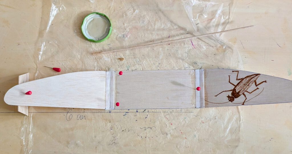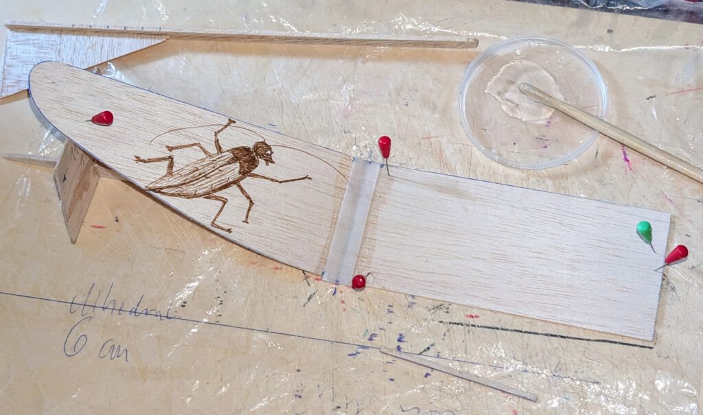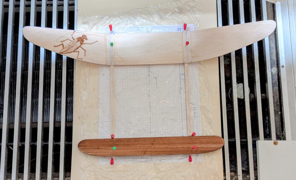 Pin wing center section according to plan on building board. Cement outer sections one by one to center section paying attention to given dihedral. Let dry. Use linen/cotton band for reinforcing joints. Let dry.