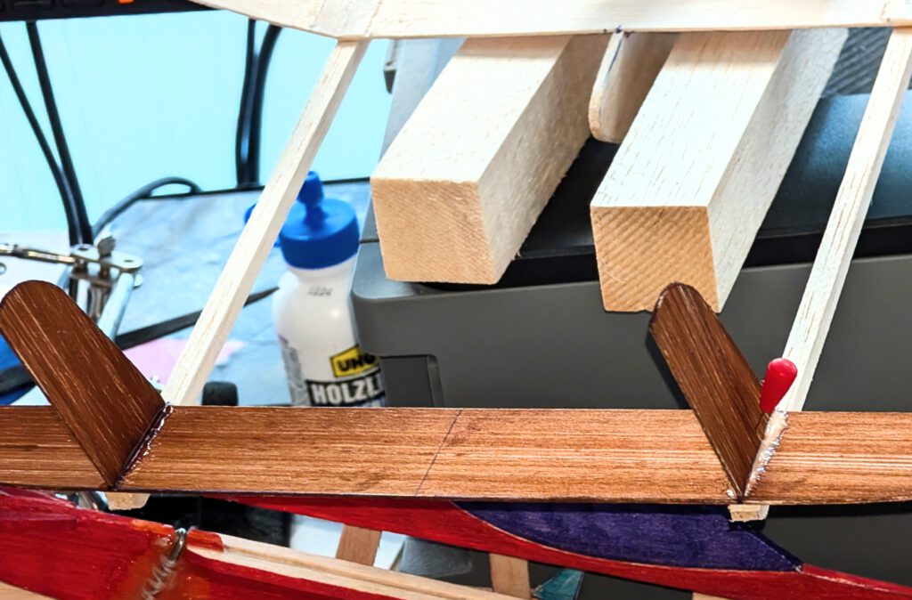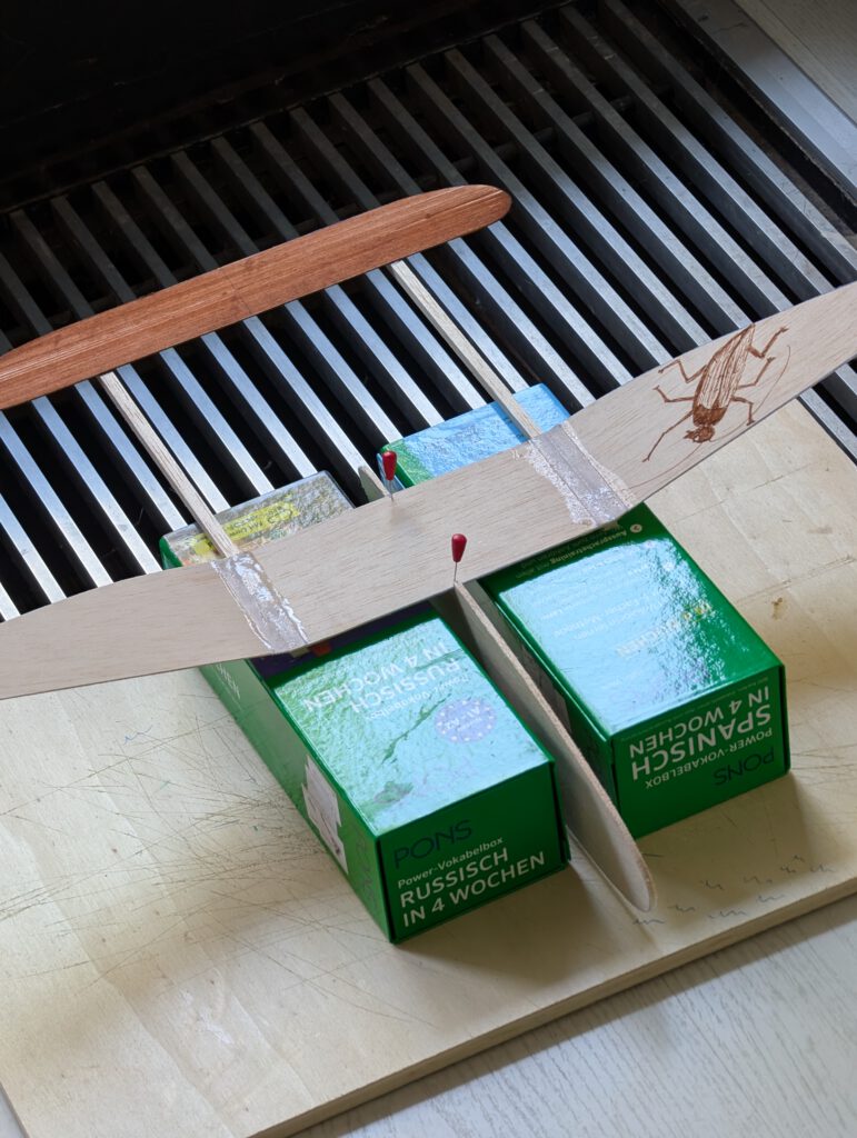 Remove wing-boom-empennage assembly from building board and lay aside. Take two voluminous books of same size or two equal sized cardboard boxes or something comparable and position both parallelly. Cement fuselage gondola to wing-boom-empennage assemblyafter having checked diligently symmetry. Hold in place with pins. Now put your nearly-ready model on both books/boxes the fuselage gondola hanging free between them. Let dry.
