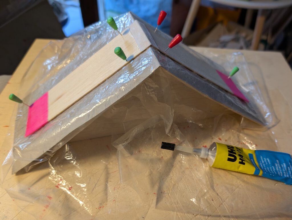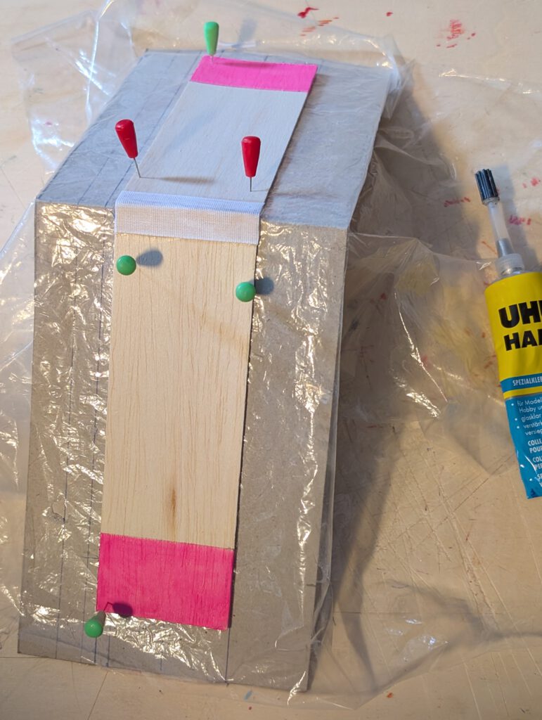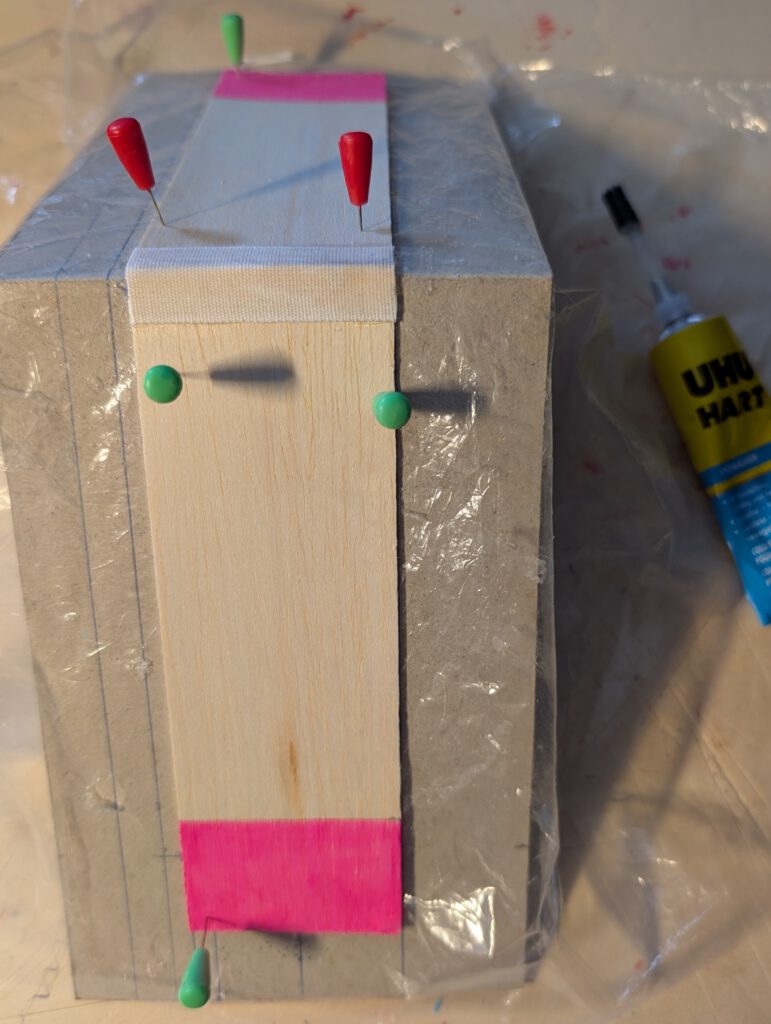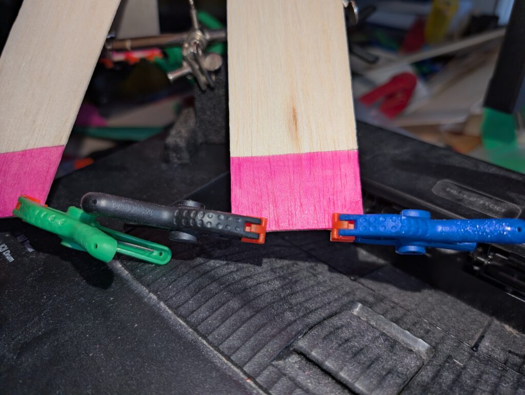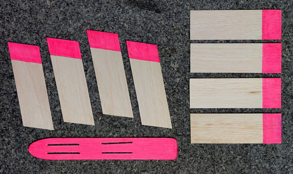 Install the eight anti-warp pinewood strips one at each wing tip. See photo. Let dry.