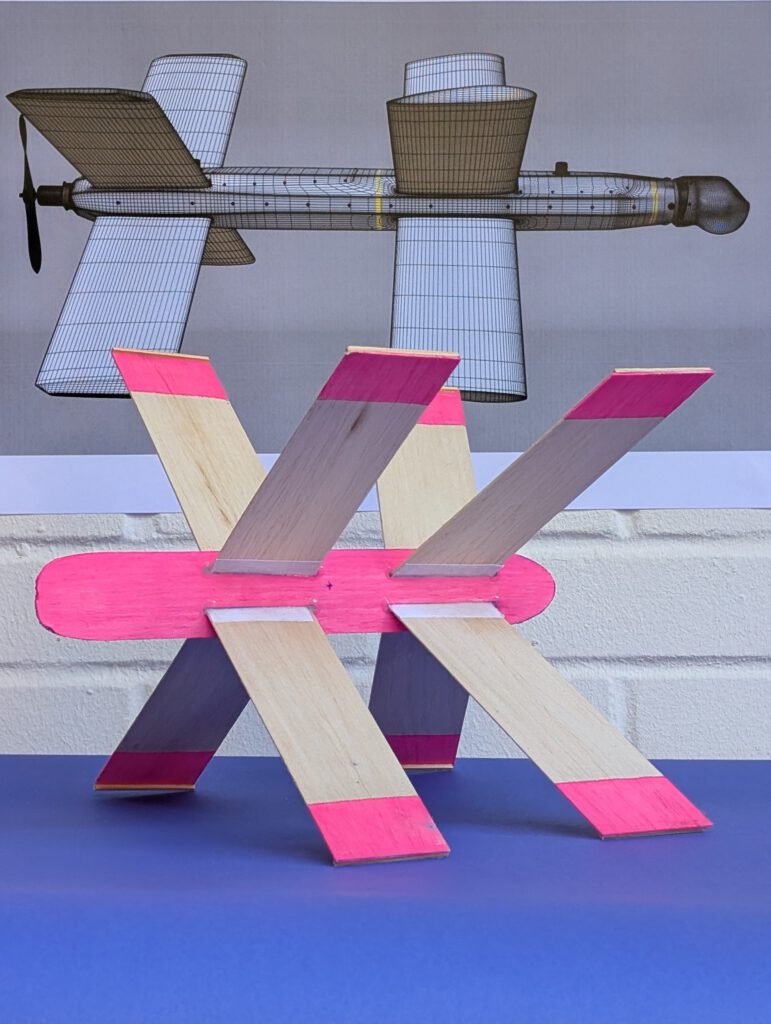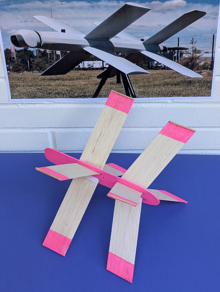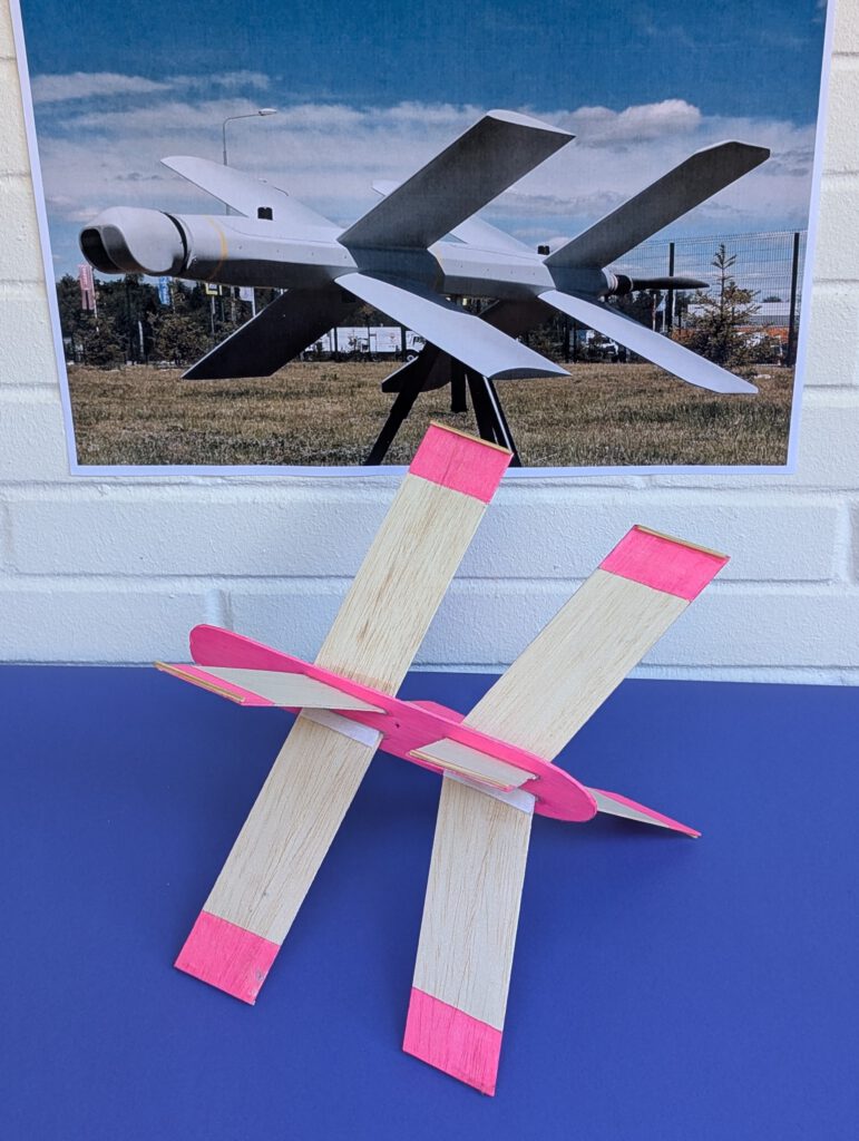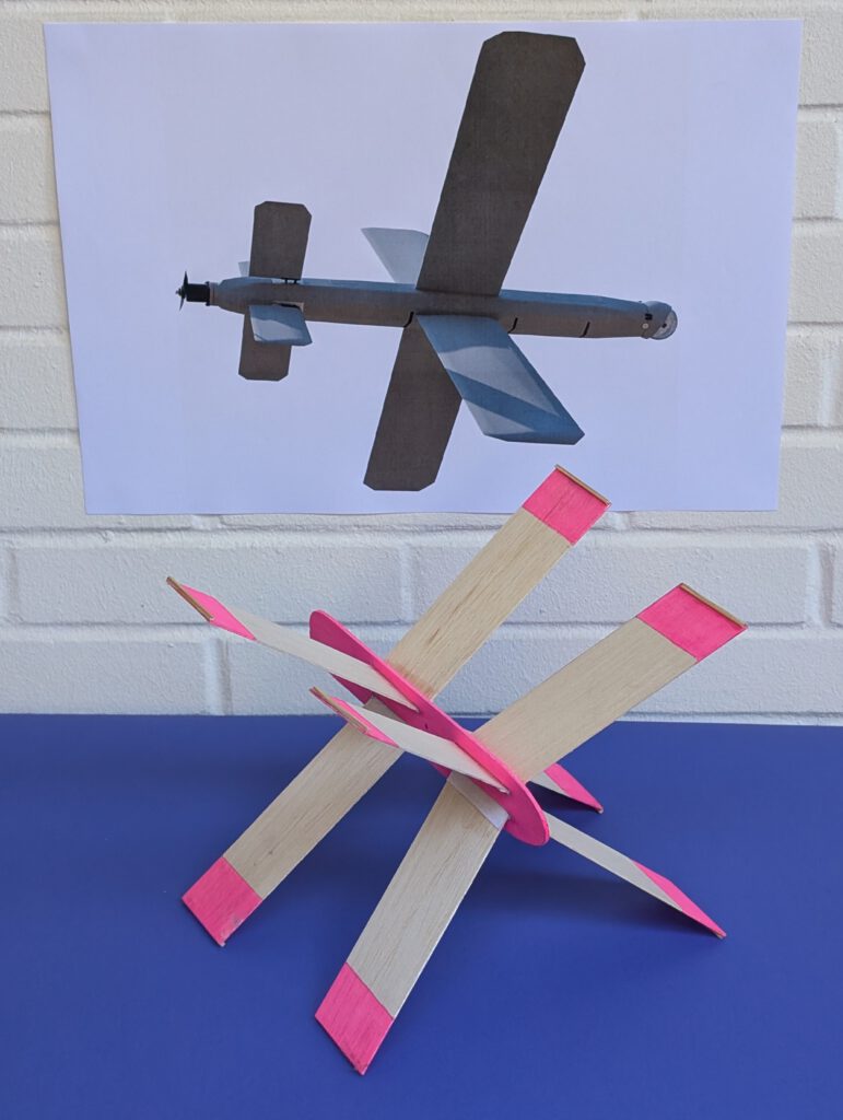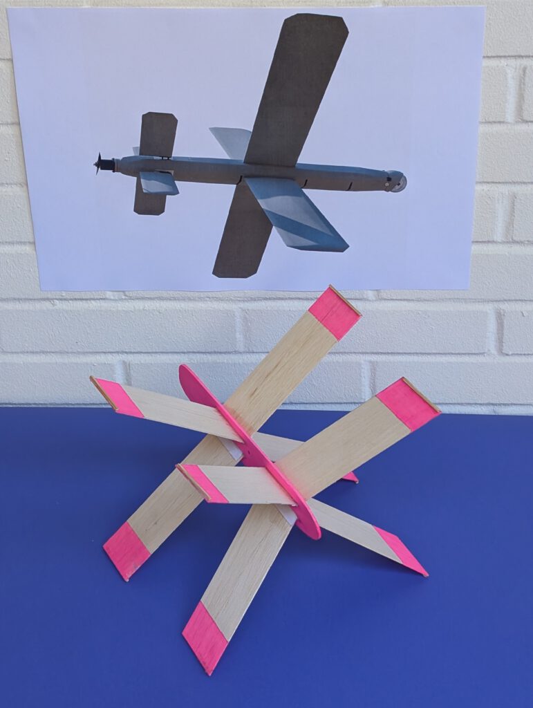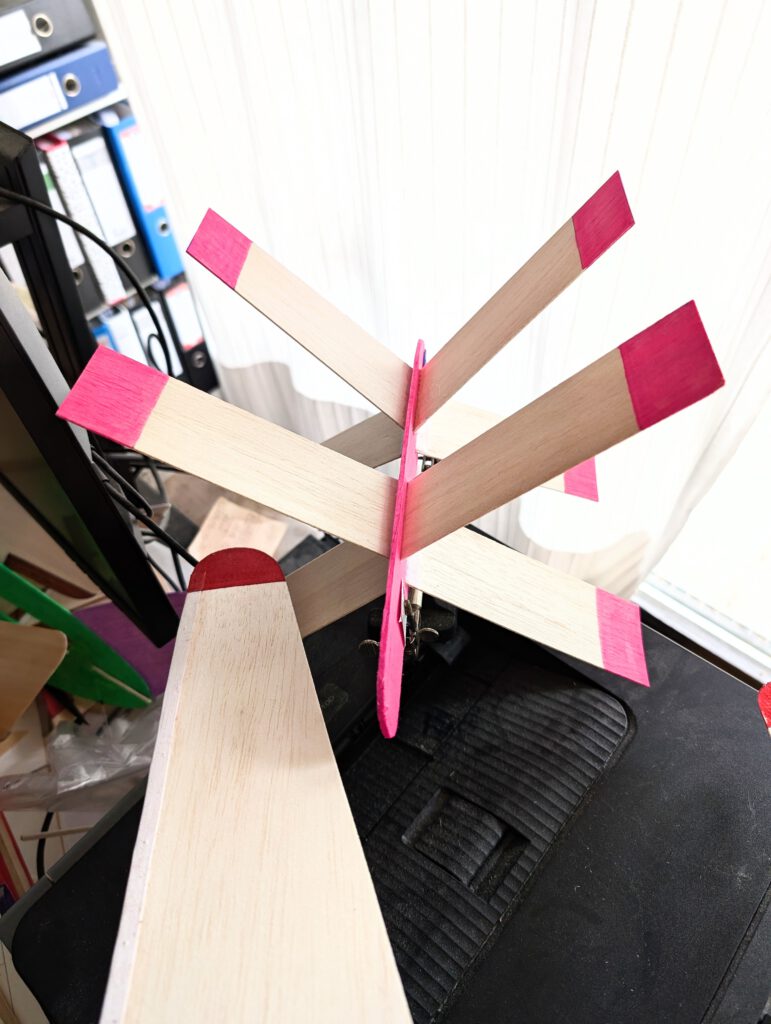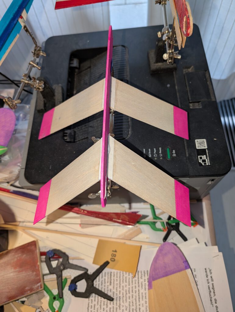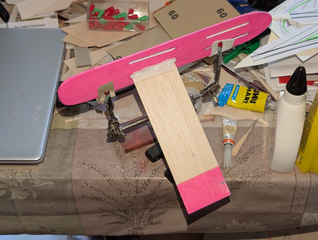 Put fuselage on a so called ‘third hand’. Glue wing pairs into fuselage slots. Double check here as well symmetry. Let dry.