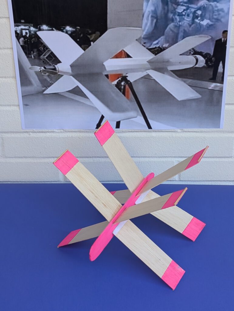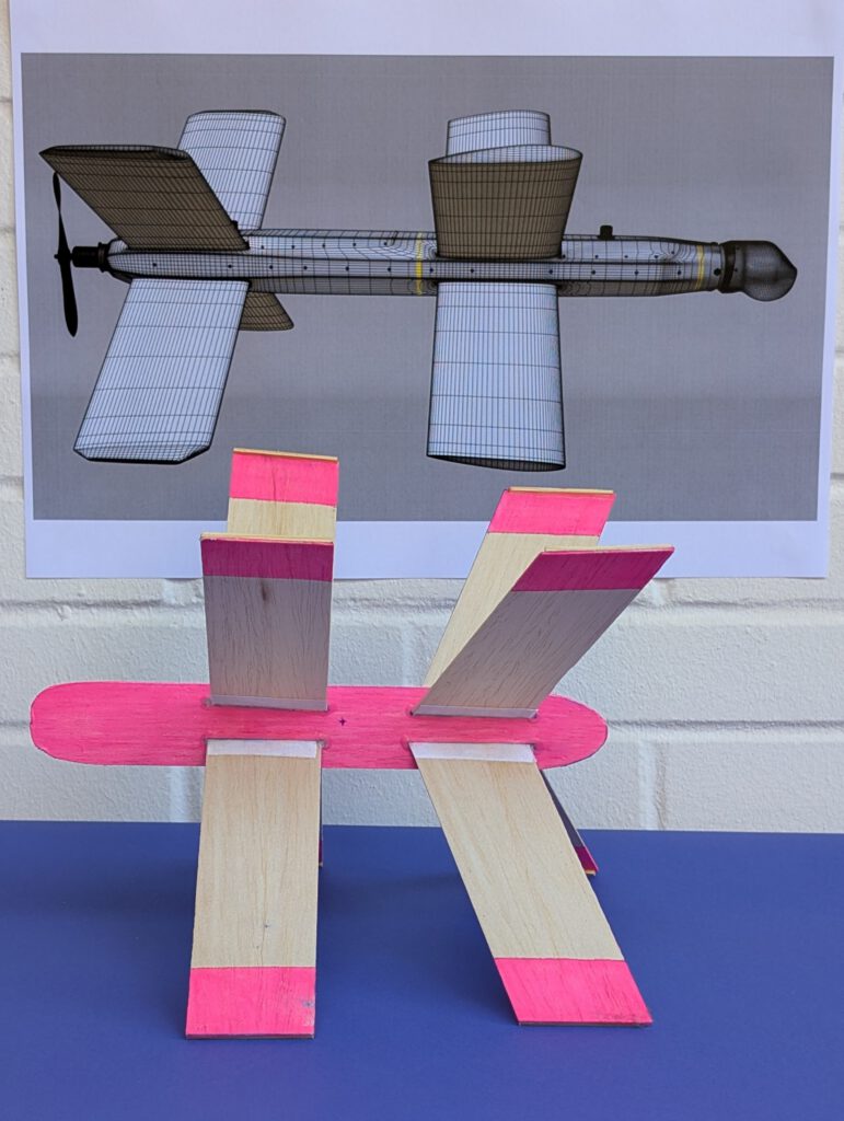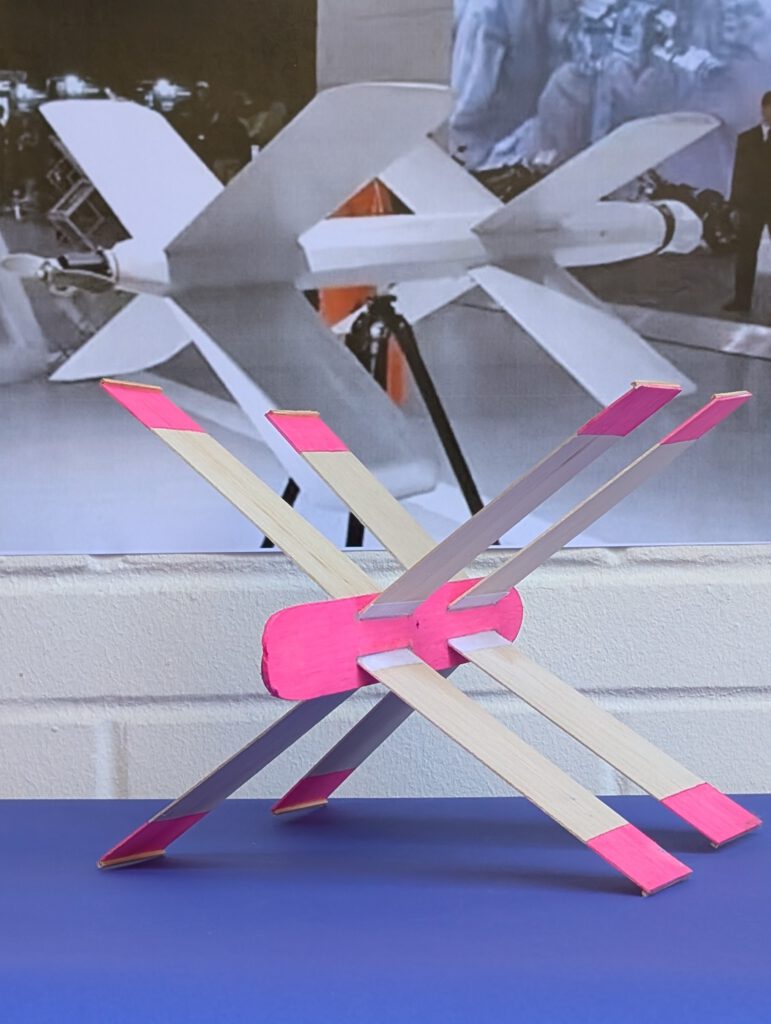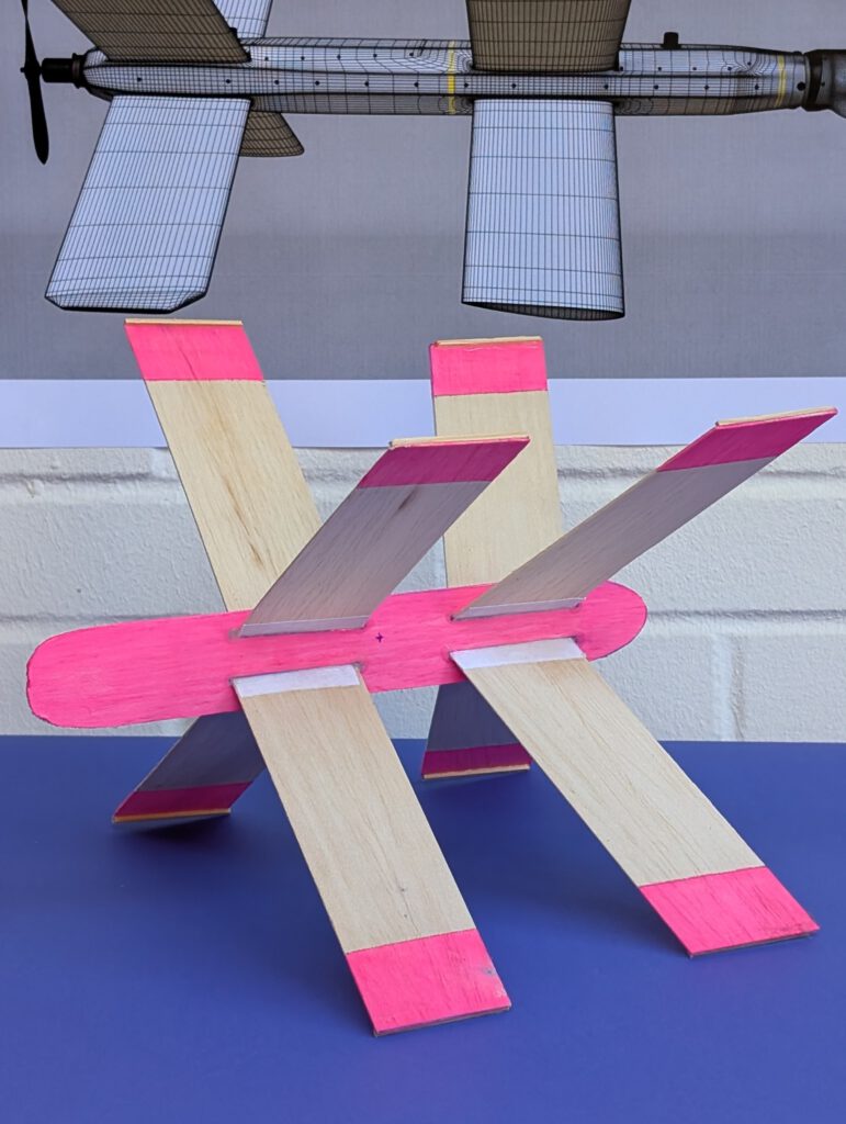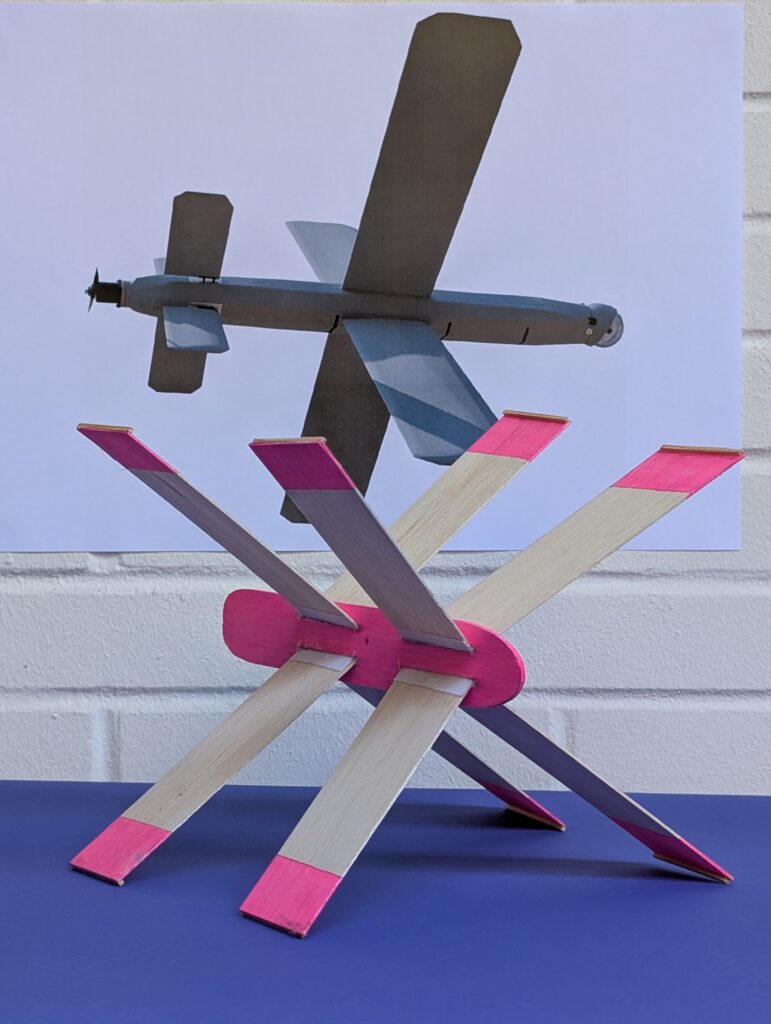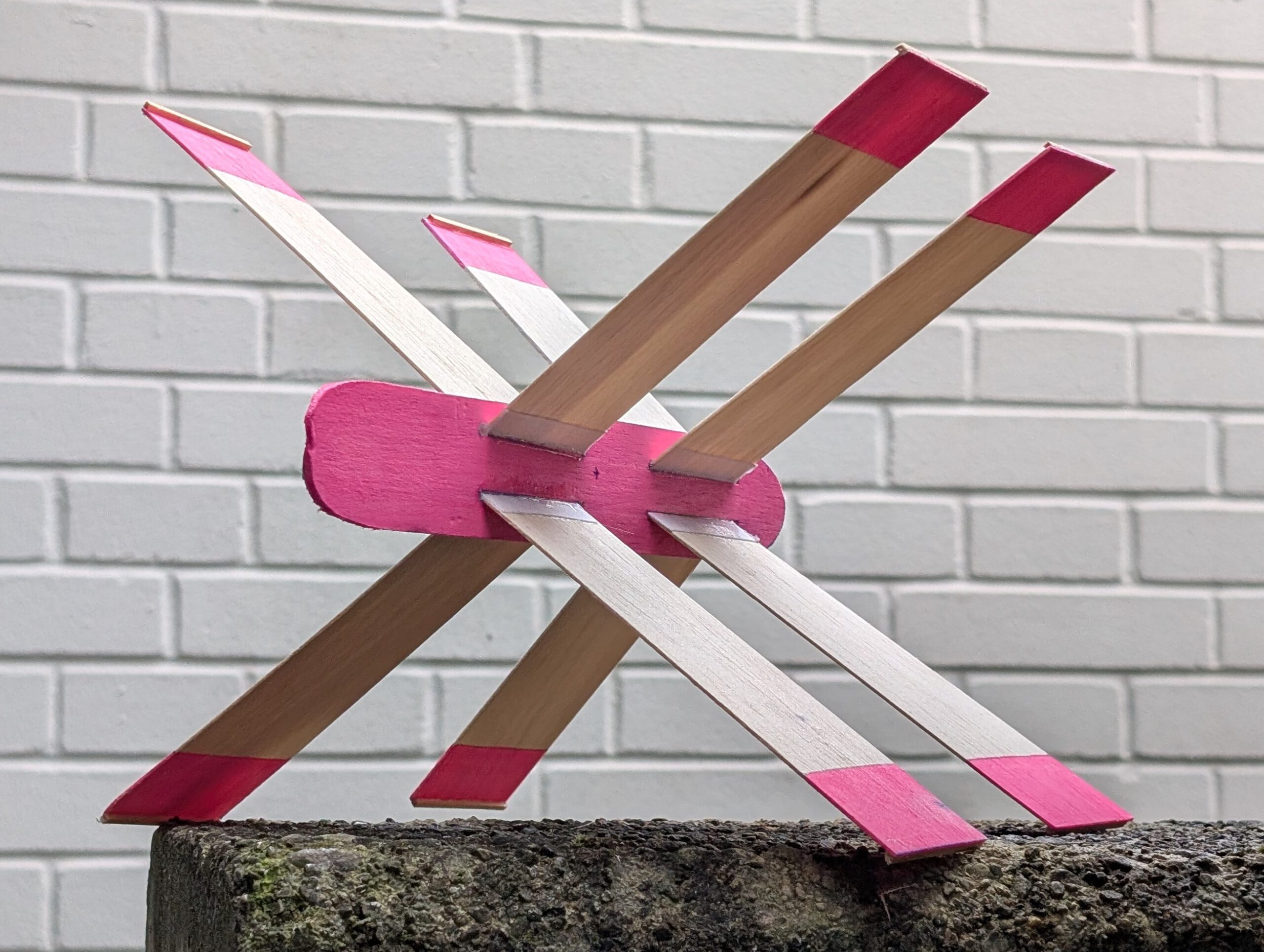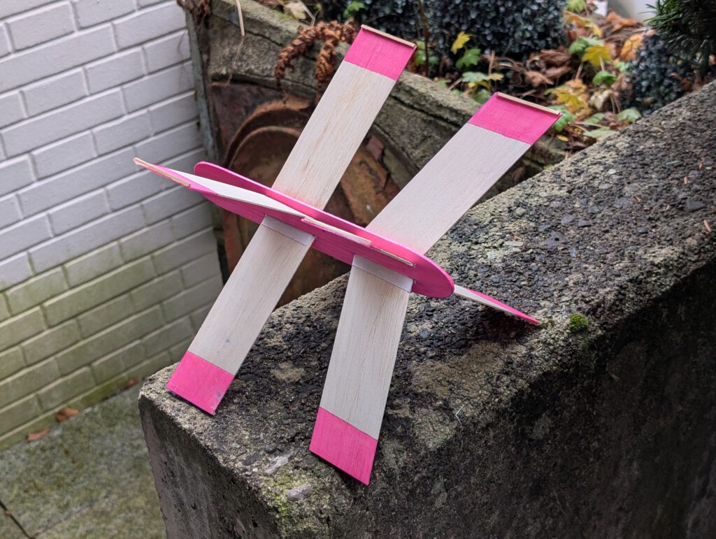 Put fuselage on a so called ‘third hand’. Glue wing pairs into fuselage slots. Double check here as well symmetry. Let dry.