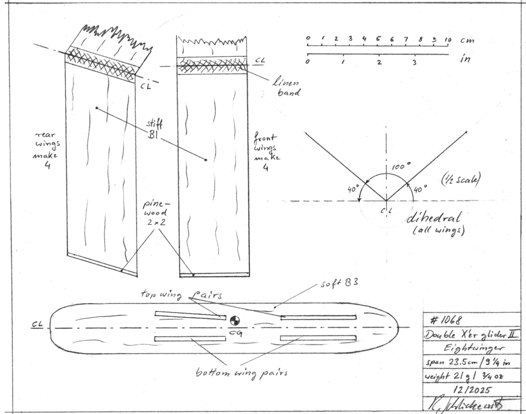 Fuselage: soft B 3; wings: stiff B 1; anti-warp pinewood strips: 2 x 2; linen/cotton band width ½ in = 12 mm; ballast: piece of steel or lead.