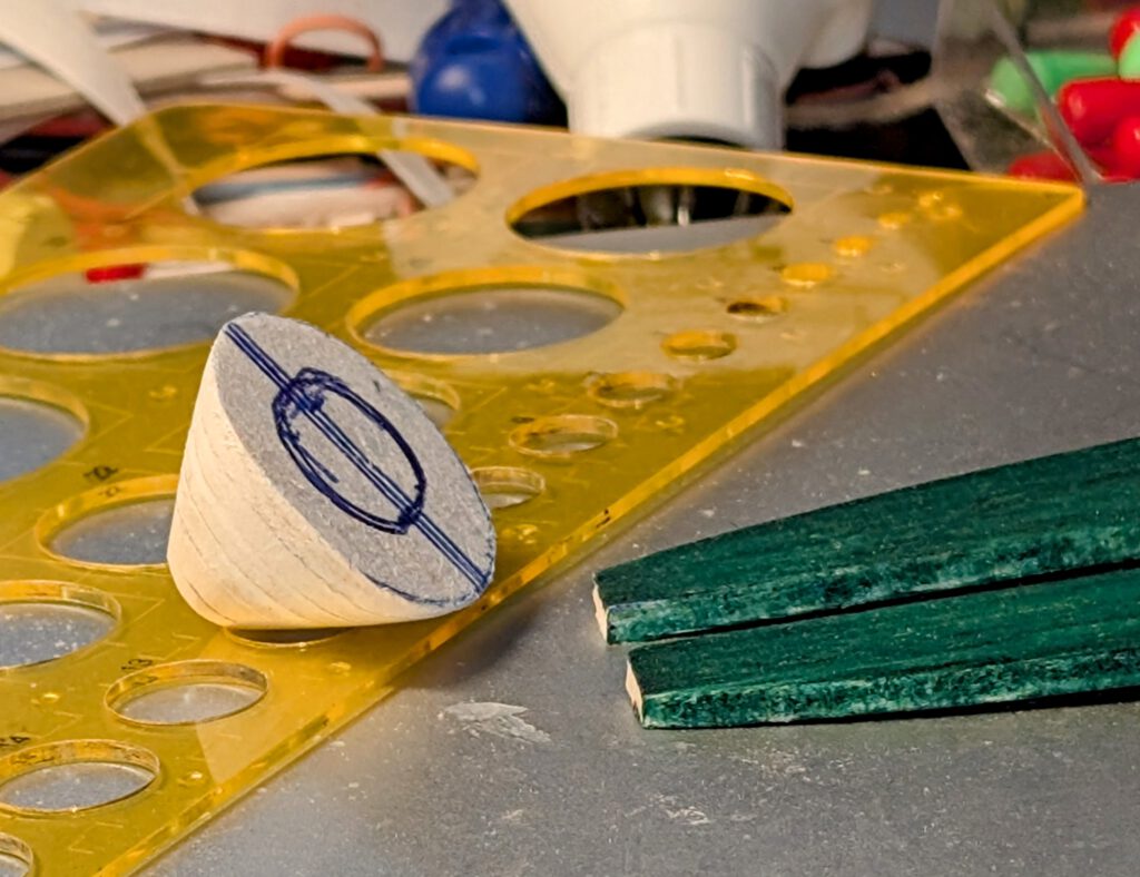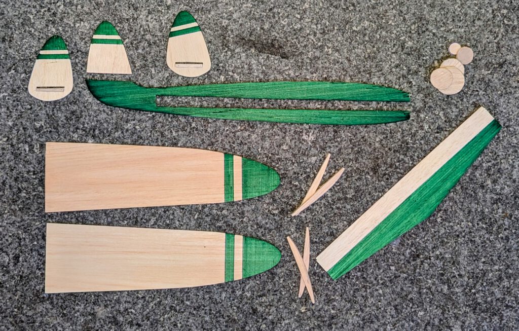 Cut out balsa parts in accordance to plan. Sand well (photo). Mark outlines before coloringfor professional results.