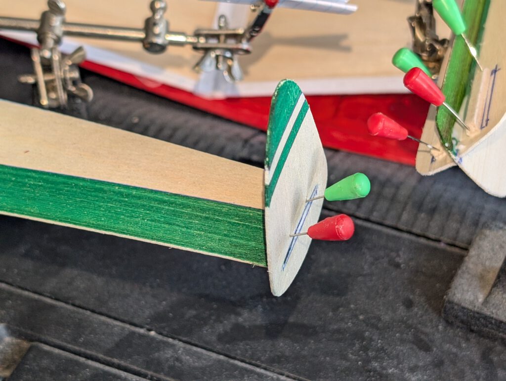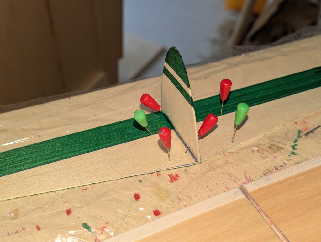 Pin horizontal stabilizer on building board. Cement central fin on horizontal stab. Check symmetry and let dry. Cement balsa strips to both outer fin insides. Fix horizontal stab with central fin on “third hand”. Cement outer fins on horizontal stab. Hold with pins and check symmetry from all sides (photo). Let dry.