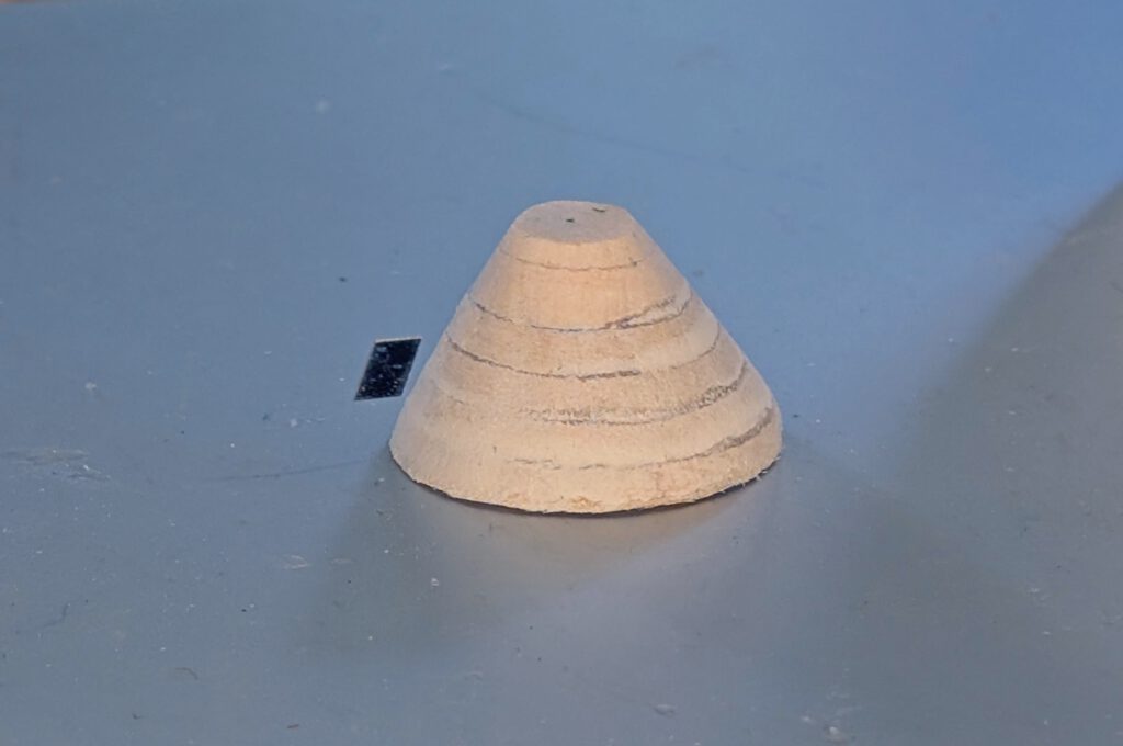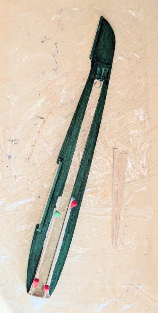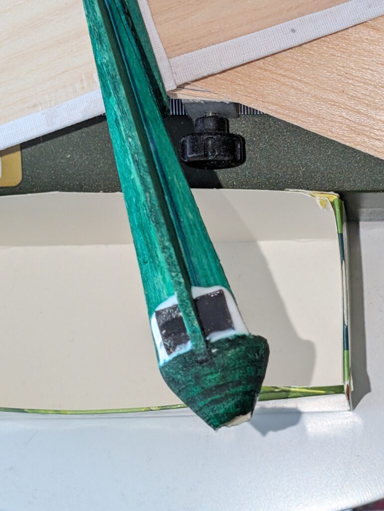 When dry check equilibrium. If there is a weight difference on one wing half, disperse a small amount of white glue near the tip of the other wing half’s underside and disperse it well. Do this if necessary twice until equilibrium is reached. Put aside and let dry.