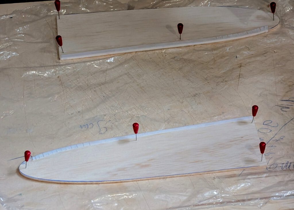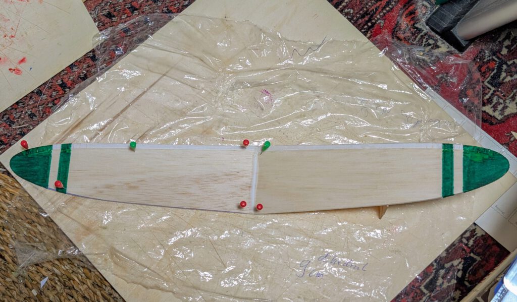 Pin one wing half on building board (photo). Underlay the other wing half’s tip at the indicated spot and at given dihedral. Cement both halves using linen to cover joining area