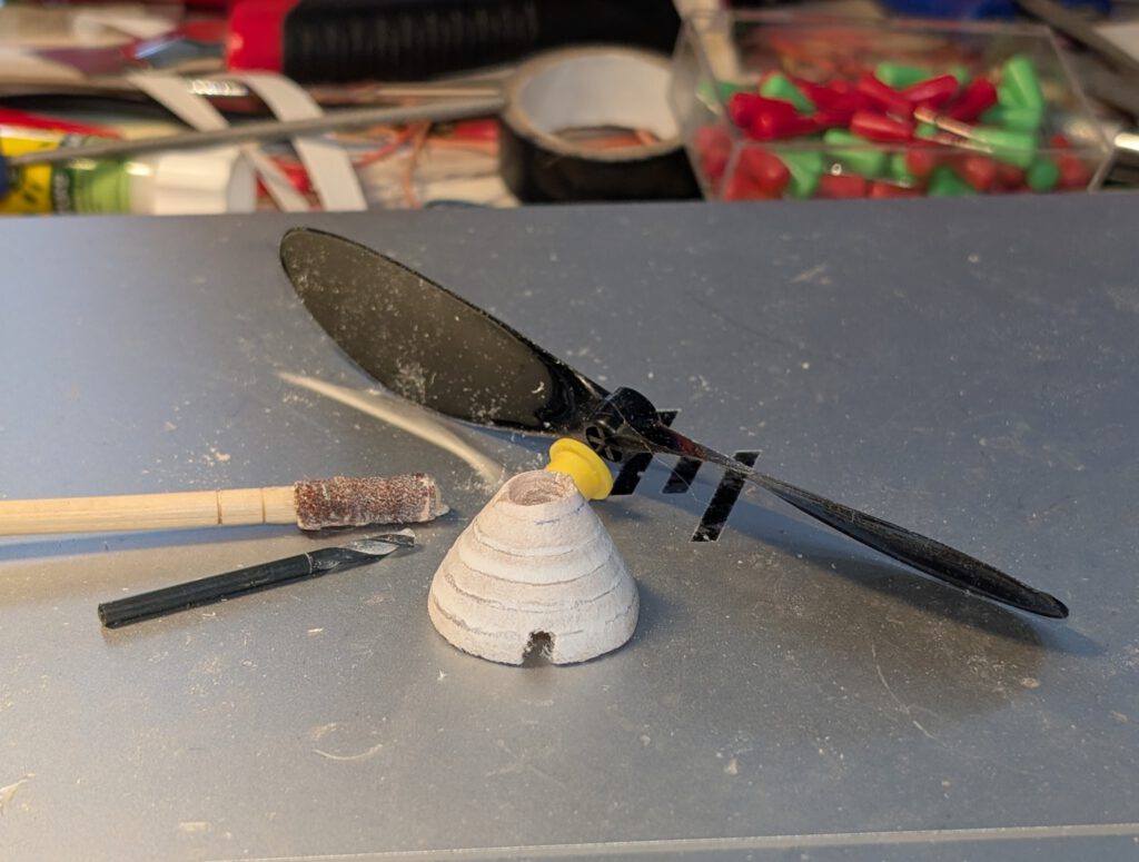 Cement B 3 rounded nose parts one on the other as shown on plan and let dry. Sand well than treat this part with balsa putty. When dry sand again. May be this procedure has to be repeated. When the nose part is smooth you can start to carve out opening which will hold prop-bearing. Start from behind and don’t do it in a hurry. A little electric drill machine can beuseful.