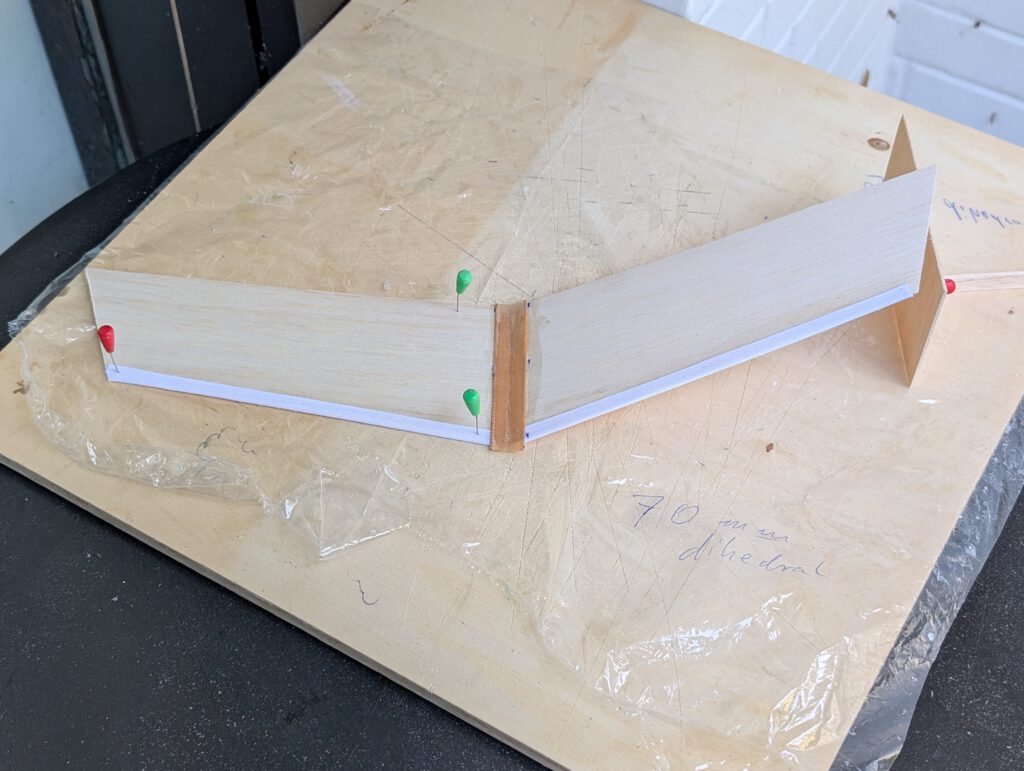Fix one wing half on your building board with pins. Cement corresponding half to it payingattention to dihedral given on plan. Cover center joining line with linen band and ample glue. Let dry.