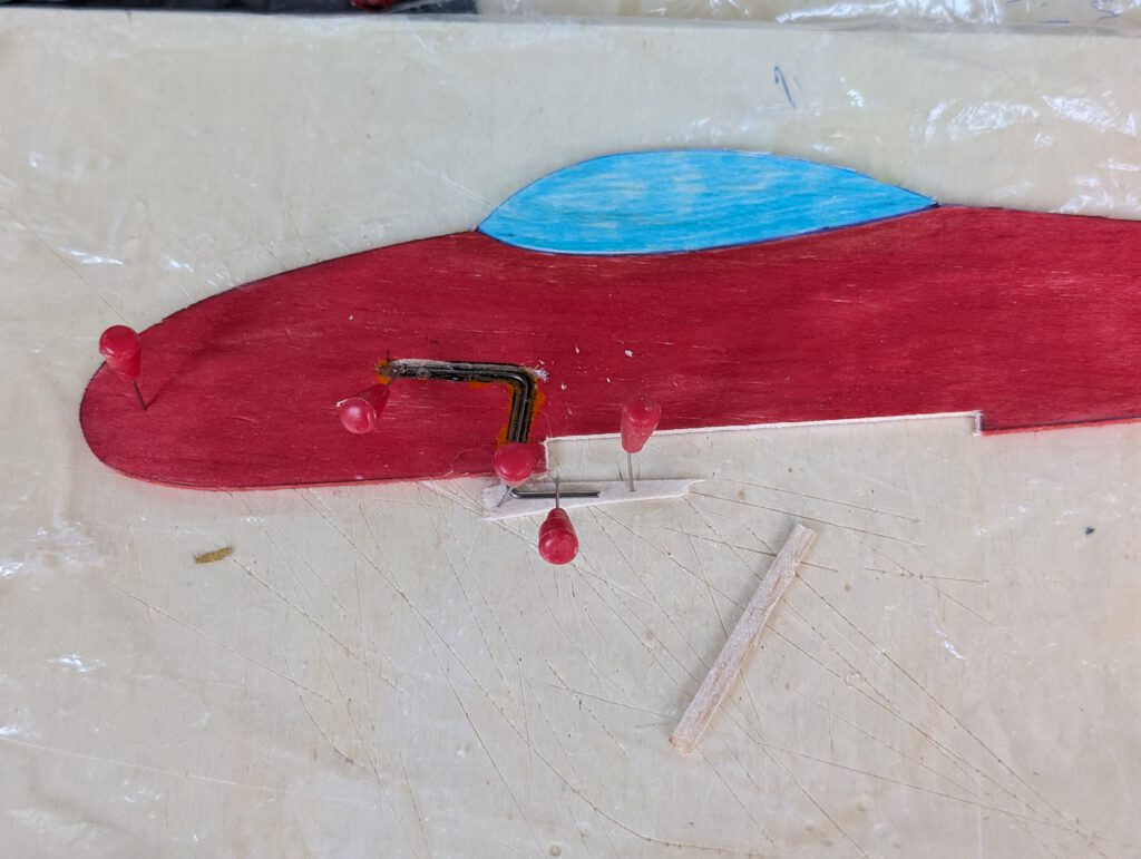 Cement wing support strips in to their place on both sides of fuselage using clamps or clothespins to hold (see photo).