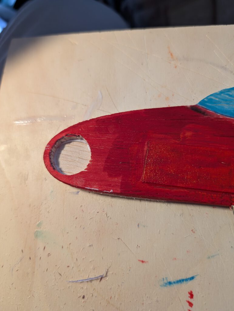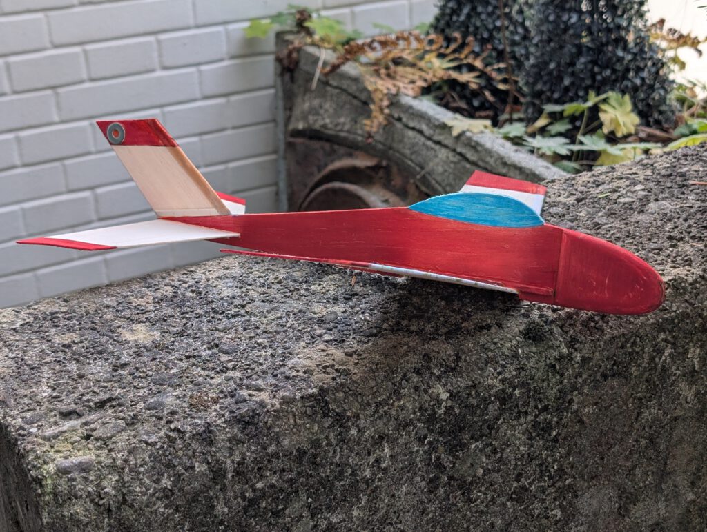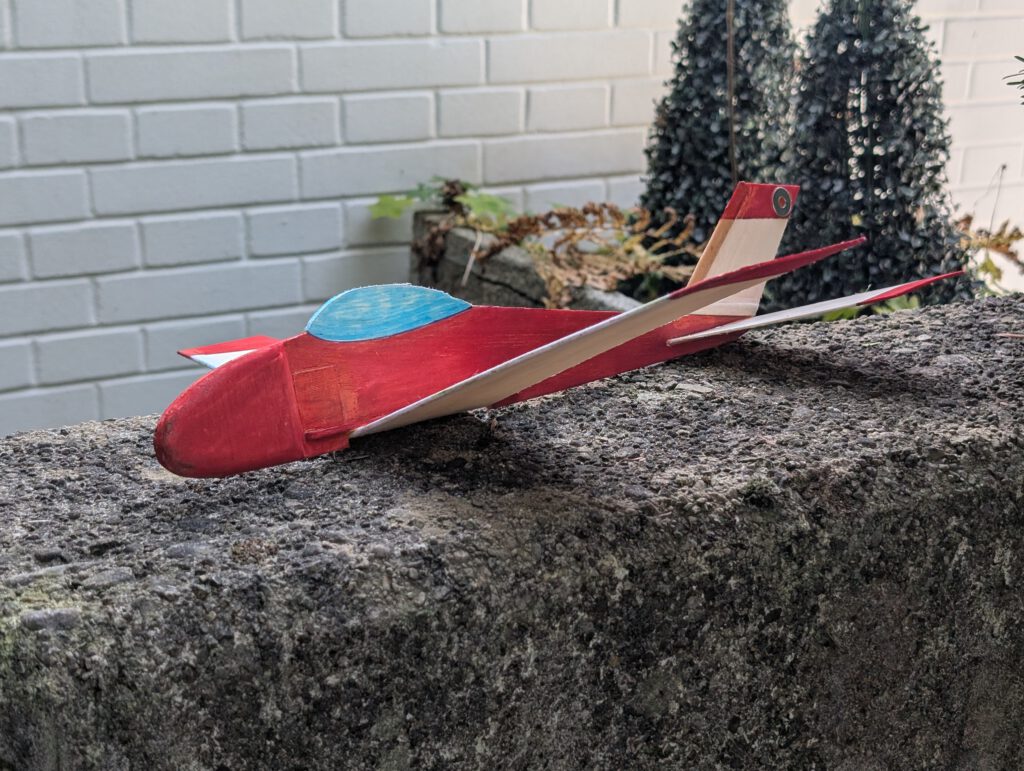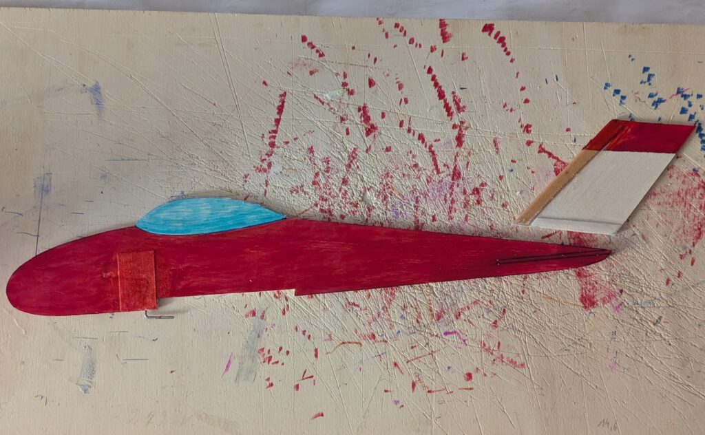 If wing has the tendency to rest only on one side then it is too heavy on this side. To compensate the imbalance disperse an amount of white wood glue on the opposite wing half’s tip underside. Do it if necessary twice until balance is obtained.