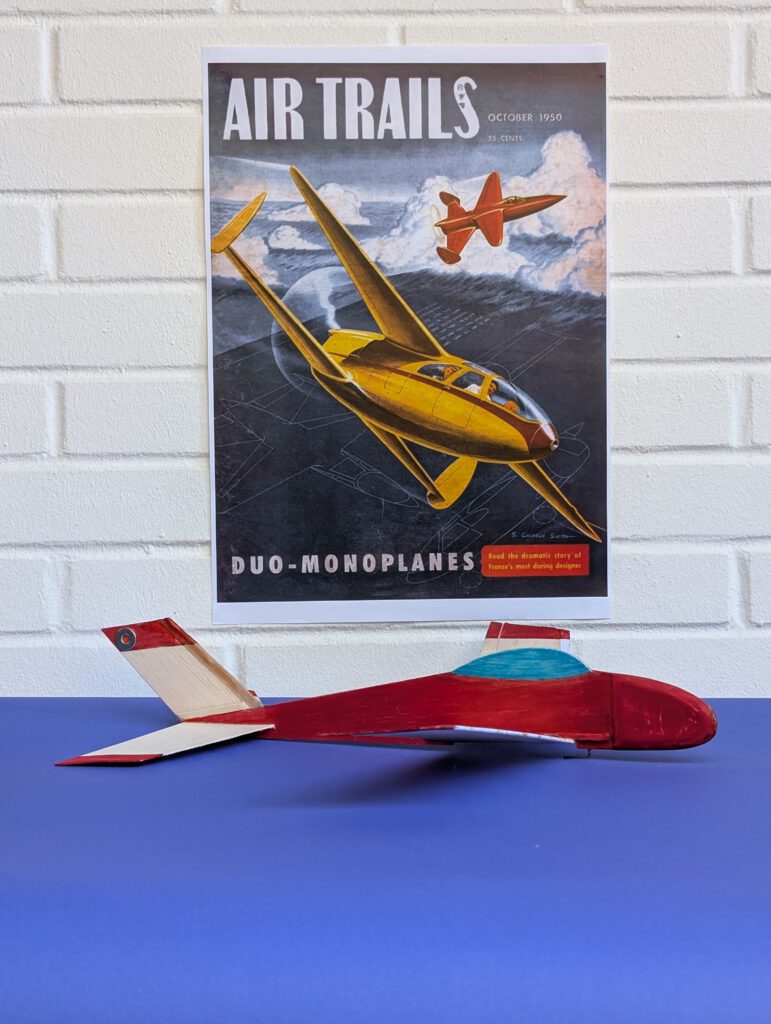 Cut out trim rudder on left wing half. Bevel as shown on detail drawing. Cement linen bandas shown on underside as it will work as a simple but effective hinge.